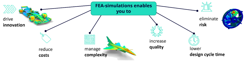 Penerapan simulasi berbasiah Finite Element Analysis (FEA) memiliki banyak keuntungan baik untuk engineer sebagai usernya atau pun untuk perusahaan, berikut beberapa manfaat penggunaan FEA di Industri: