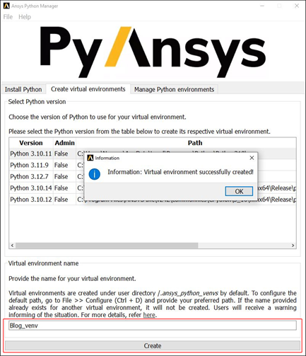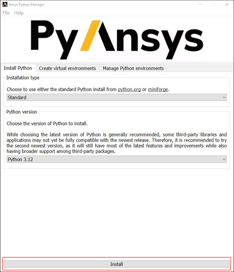 Once the installation is complete, your selected Python version will be ready to use for creating virtual environments and managing PyAnsys packages.