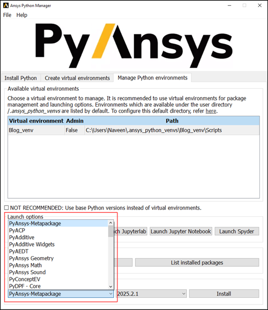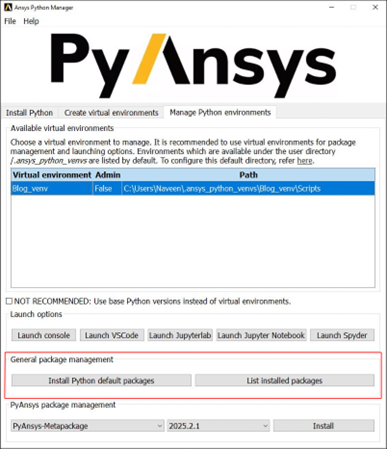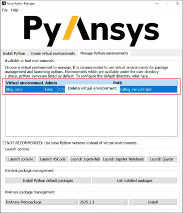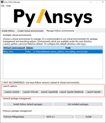 The Ansys Python Manager simplifies Python setup for simulation and engineering workflows. It handles Python installations, virtual environments, and PyAnsys packages through an intuitive interface that keeps your workflow efficient. With flexible options to launch environments in various IDEs and shells, it lets engineers focus on innovation instead of setup. By leveraging its full potential, you can speed up PyAnsys development, maintain consistent environments, and reduce manual configuration.